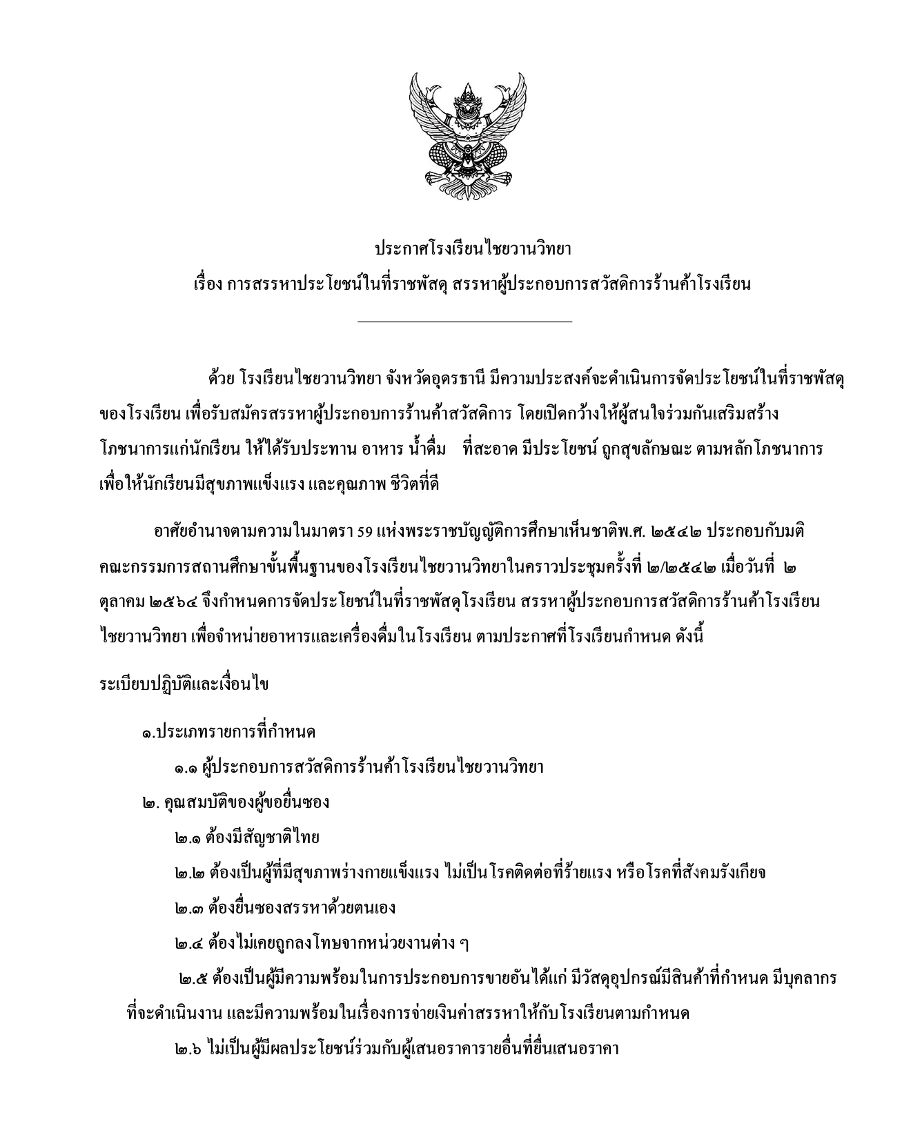 ประกาศโรงเรียนไชยวานวิทยา เรื่อง การสรรหาประโยชน์ในที่ราชพัสดุสรรหาผู้ประกอบการสวัสดิการร้านค้าโรงเรียน