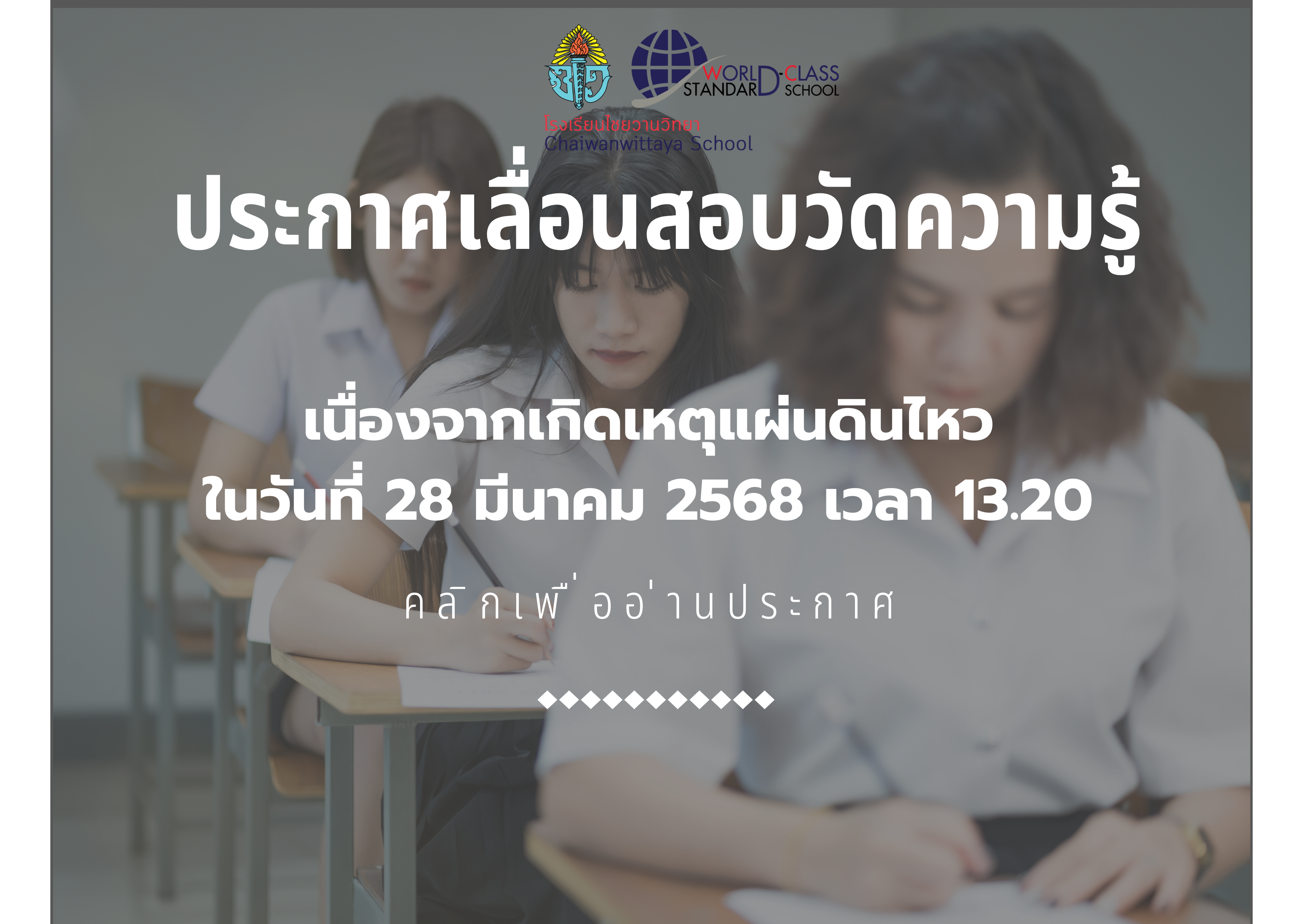 ประกาศโรงเรียนไชยวานวิทยาขอเลื่อนสอบวัดความรู้ นักเรียนชั้นมัธยมศึกษาปีที่ 1 และ 4 ปีการศึกษา 2568